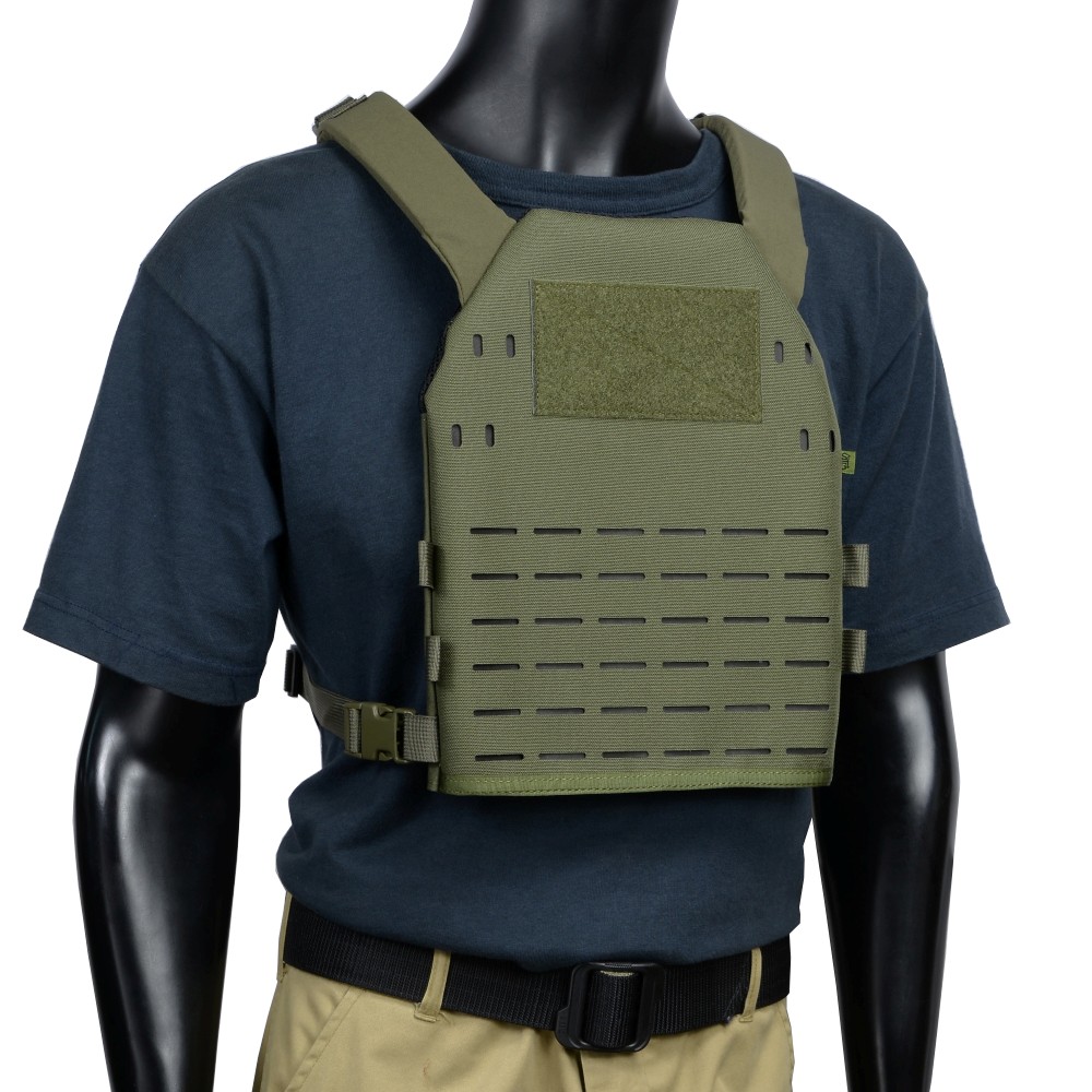 広範囲にレーザーカット式のMOLLE/PALSスリットが開けられており、ミッションに応じてMOLLE装備を増設可能。フロント上部の縦長型のスリットは、ボディカムを取り付けたりケーブルガイドとして活用できます。ポーチ類を取り付けてカスタムするのはもちろん、ベルト主体の装備と組み合わせて単体でボディアーマーとして使うのもオススメ。