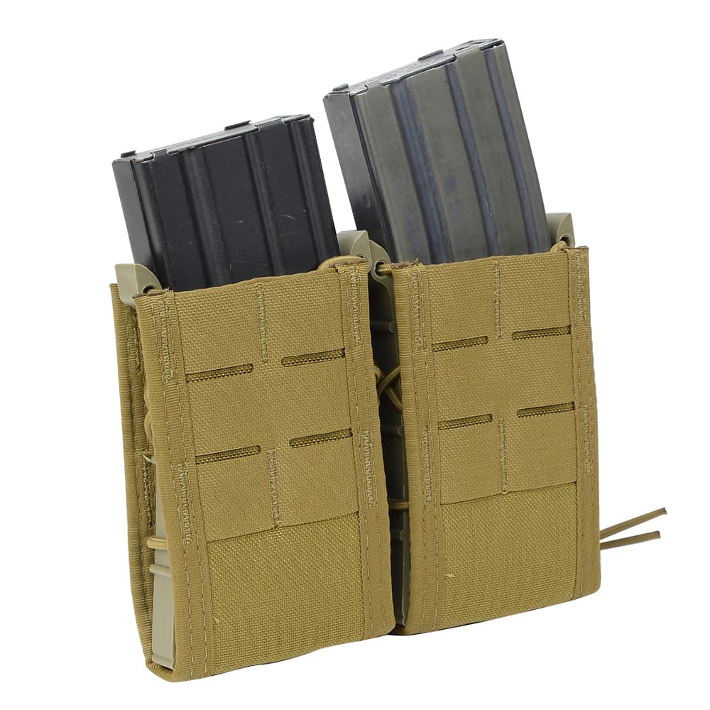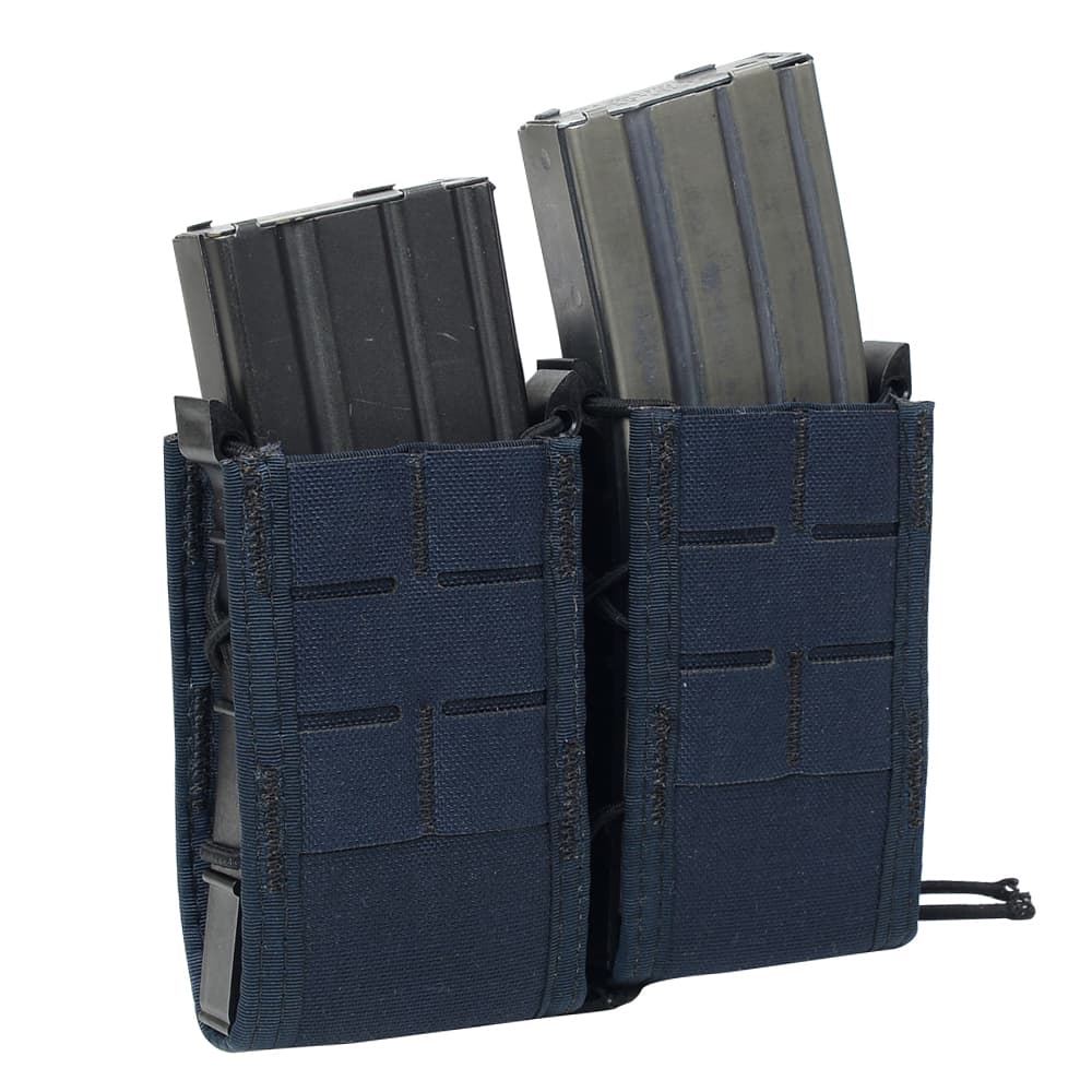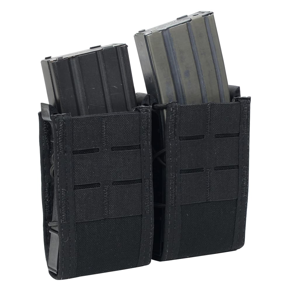 フロント/バックのコーデュラナイロン生地と、両サイドのポリマー製ガイドパーツを伸縮性のあるバンジーコードで編み込む独自構造により、どんなマガジンでも最適なフィット感にセッティング。逆八の字状に開いた両サイドのポリマー製ガイドが、引っ掛かりや生地部分の折れを防ぎスムーズな抜き差しを可能にします。