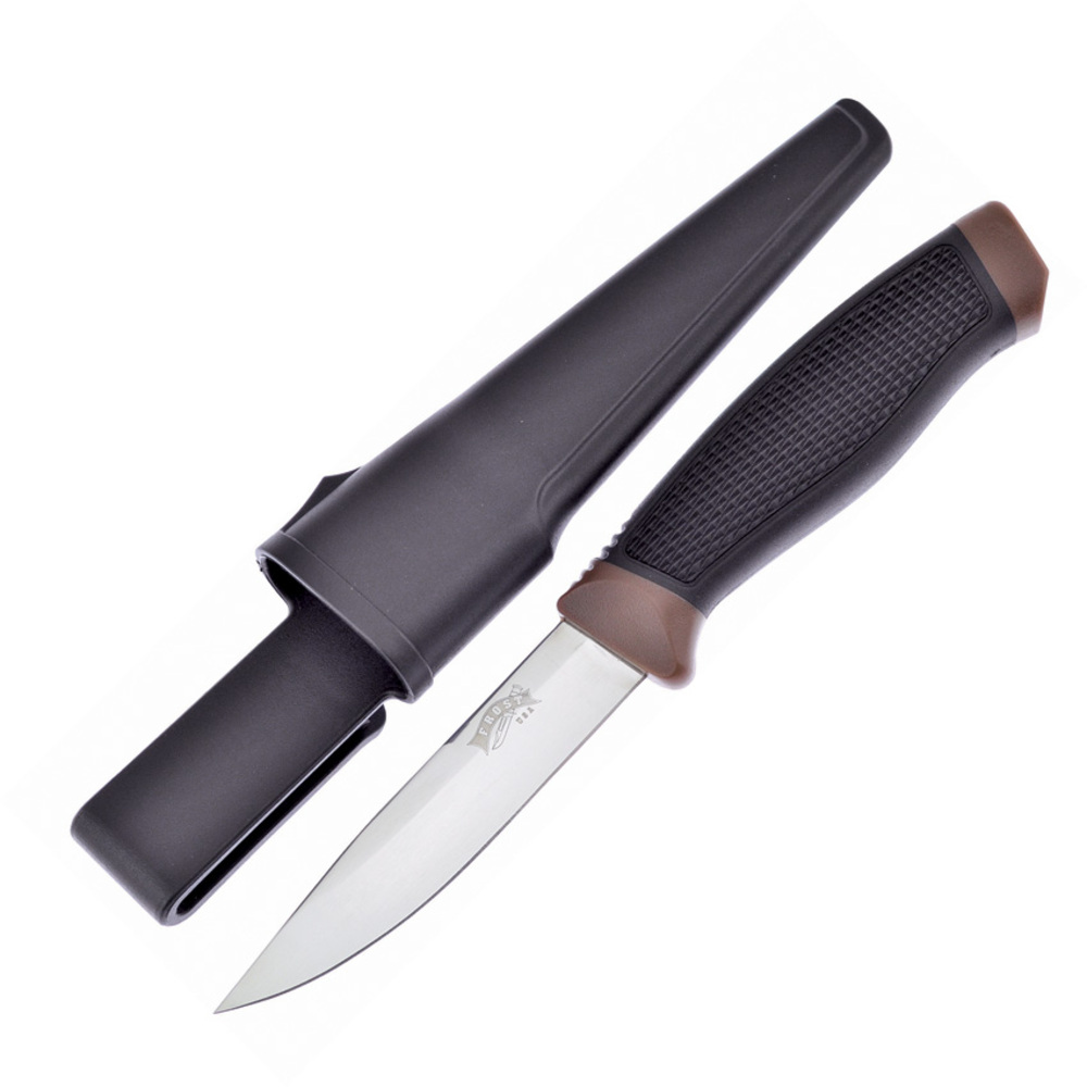 全長8.5インチ(21.59cm)。4インチ(10.16cm)ミラーフィニッシュ3Cr13ステンレスのブレード。ブラウンABSハンドル、ブラックラバーオンレイ ブラックABSベルトシース。