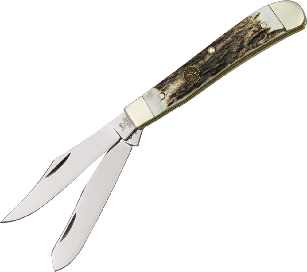 トラッパー。ナイフを閉じた状態で約3.88インチ。ステンレス製クリップブレードとスペイブレード。鹿の牡鹿のハンドル。ニッケルシルバーのボルスター。インレイシールド。