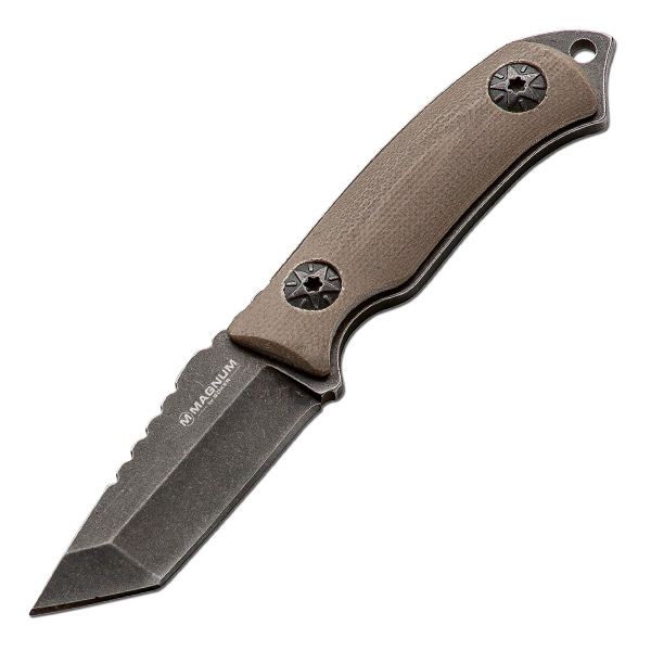 ブレードがストーンウォッシュ加工を施したような黒くヴィンテージ風な仕上がりになっている、ボーカーマグナムのネックナイフ リルフレンド タント。ブレードはフルタングになっており、素材に丈夫な440ステンレス鋼を使用。ハンドルにはG-10素材を使い握りやすくなっており、端に紐を通す穴が開いています。付属のカイデックスシースには、約70cmのボールチェーンが付いており、首から下げて使うことが可能。