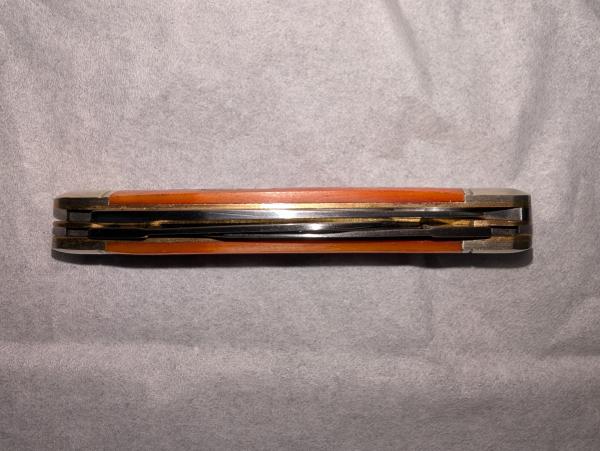 ニッケルシルバーのボルスターとオレンジ色のスムースボーンハンドル。