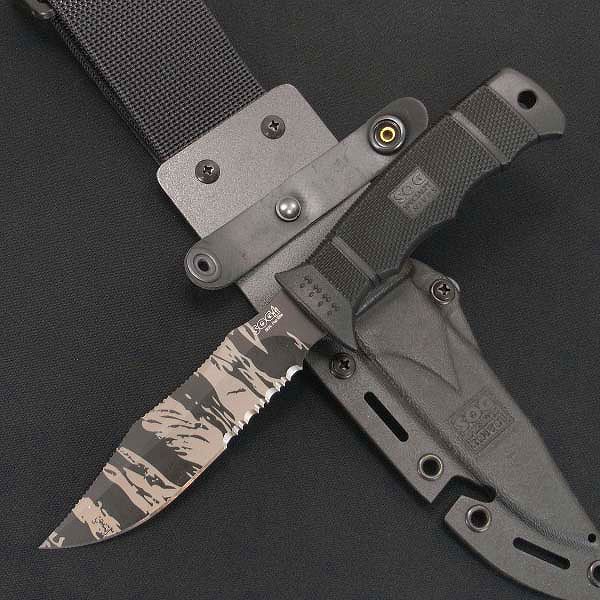 アメリカ海軍の特殊部隊用に開発された柄で通称タイガーストライプを施した半波刃のAUS6ステンレスブレード。滑り止めのダイヤモンドパターンを加工したフィンガーグルーブ付ザイテルハンドル。日本の関市で生産されたクォリティの高いナイフです。