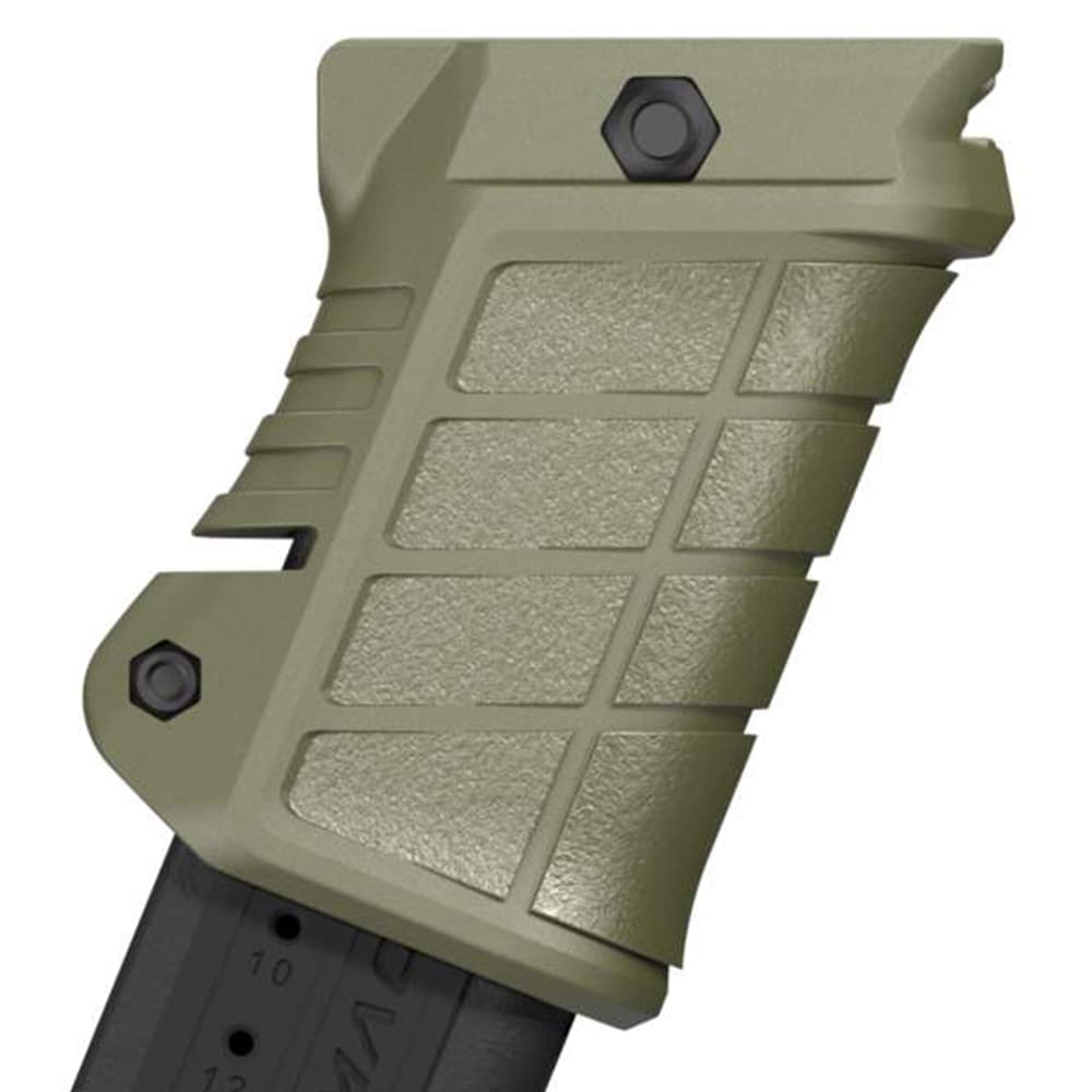 フォアグリップとマガジンホルダーを組み合わせたユニークなデザイン。対応マガジンは9mmダブルスタックタイプのハンドガンやSMGで、グリップ下部のネジを調整することで、しっかりと保持します。