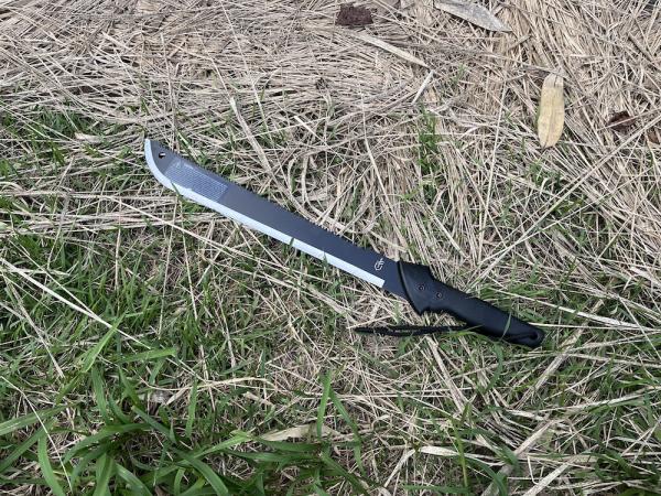 立ったままで、ススキなどを根元から薙ぐために十分な長さを持つガーバーのゲーターマチェット。