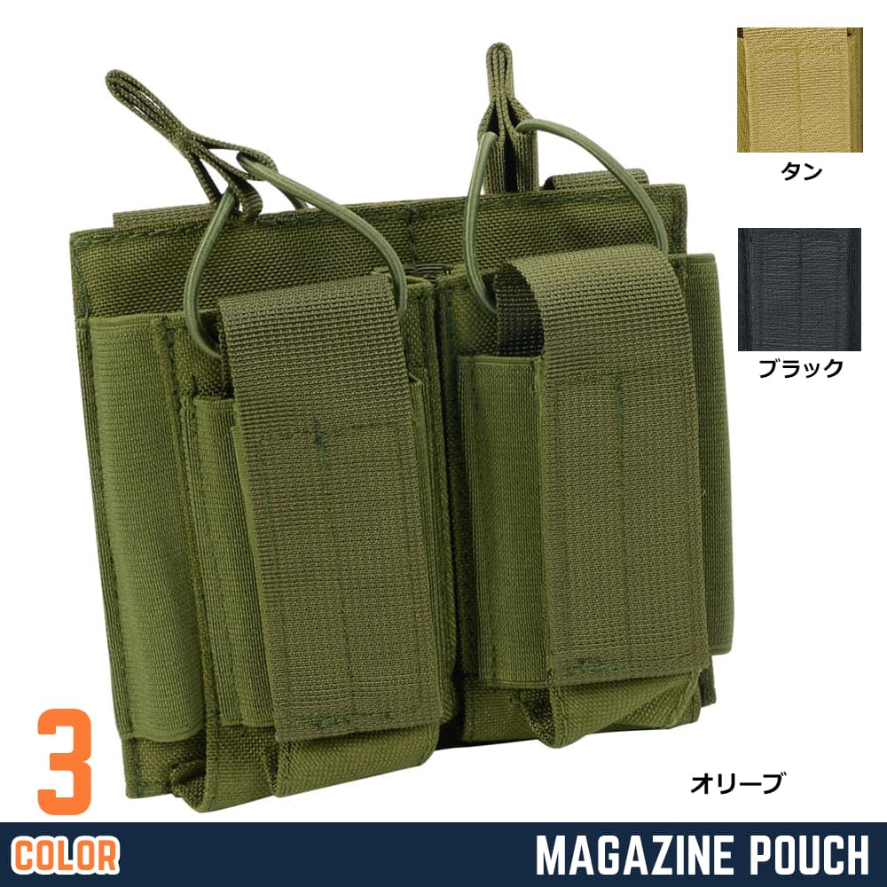 ライフル・ハンドガン兼用マガジンポーチは、ライフル、ハンドガン用のマガジンのどちらも収納できるマガジンポーチです。サバイバルゲームやミリタリー装備で使用され、サイズ調整可能なゴムバンドやベルクロフラップを備え、異なる形状や長さのマガジンに対応します。プレートキャリアやベルトへ装着できるMOLLE規格対応のものが多く、装備の軽量化と携行性の向上を同時に実現します。