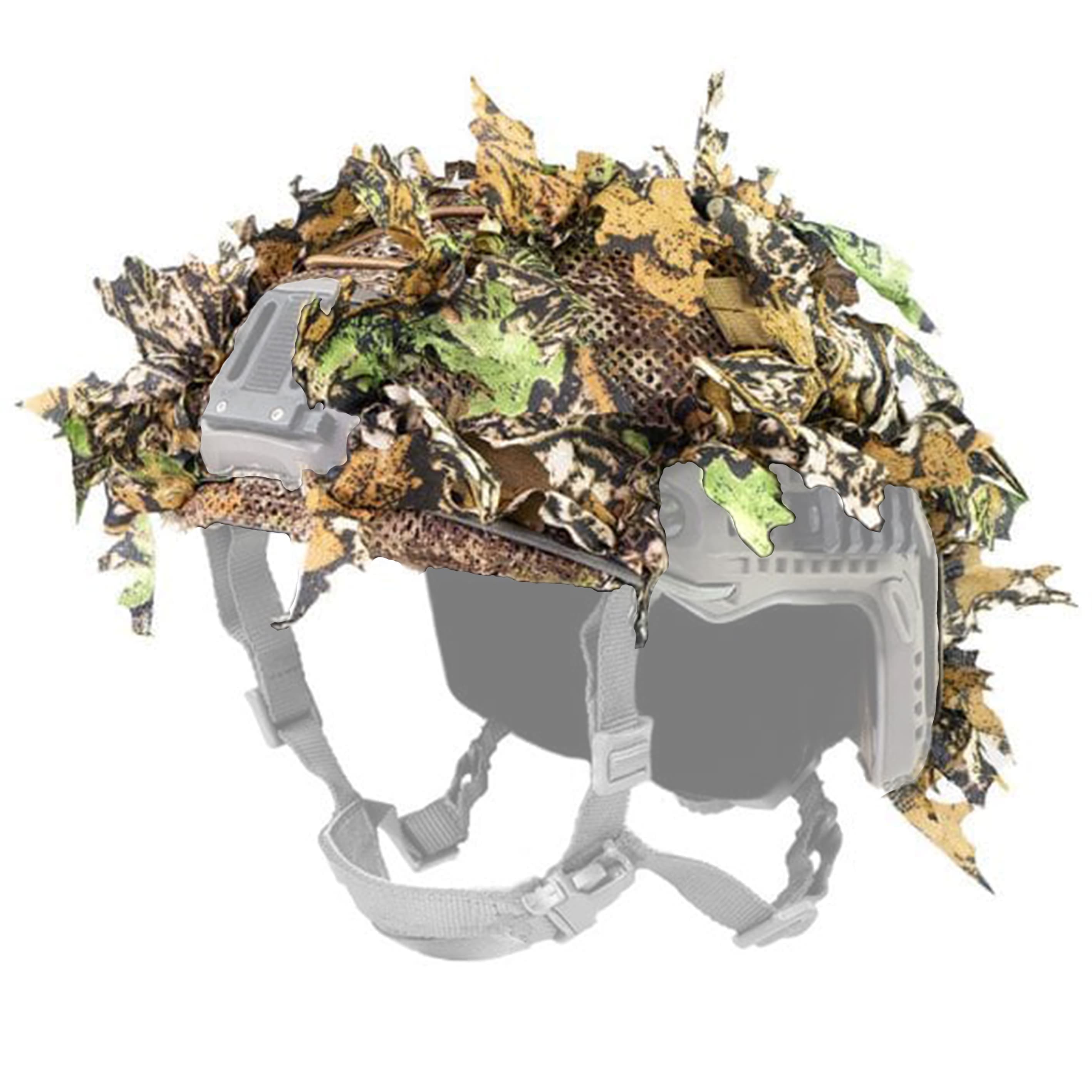 丸く目立ちやすいヘルメットの輪郭を3Dリーフ崩し、背景へ溶け込ませるヘルメットカバー。