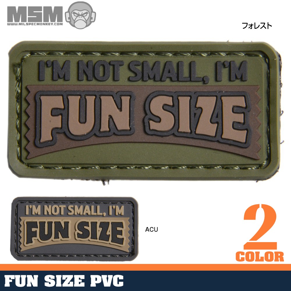 「IM NOT SMALL IM FUN SIZE」の文字が浮き文字でデザインされたPVC(ポリ塩化ビニル)製のパッチ。
