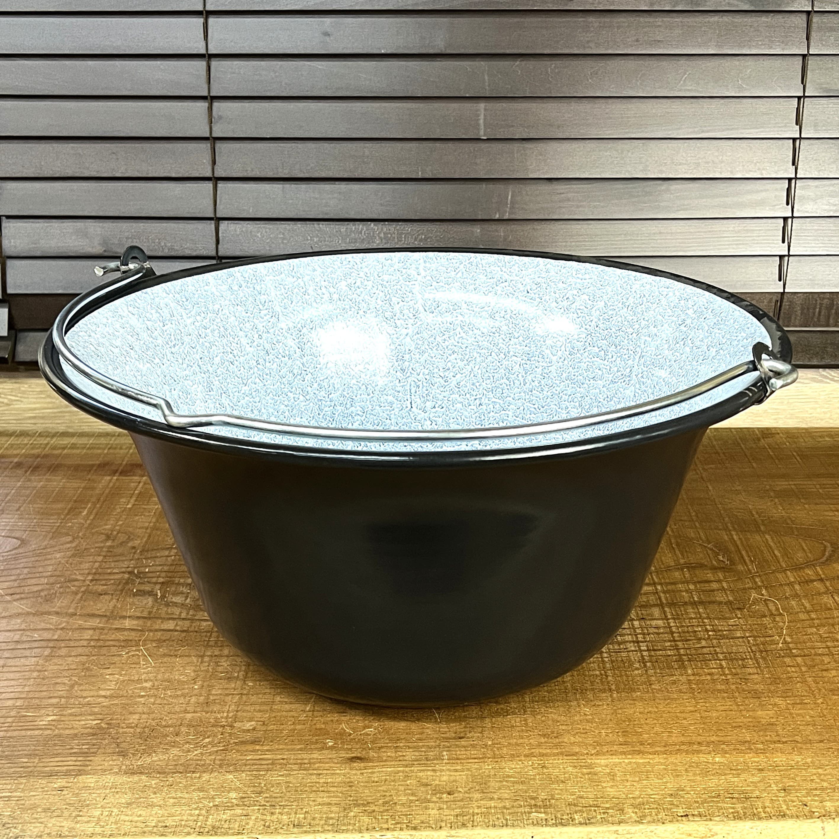 表面はEnamel(エナメル)、日本語で琺瑯(ホーロー)加工がされており、錆びにくいのが特徴。外側は黒、内部は青と白のホーロー加工が施されています。