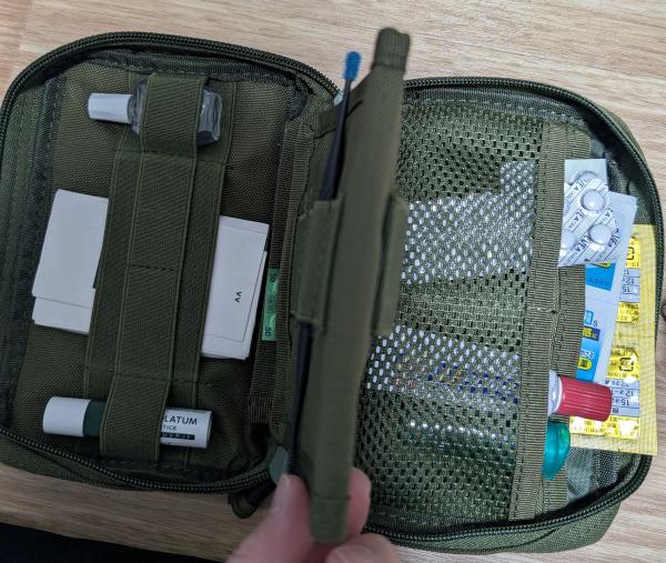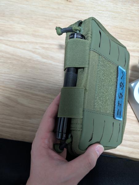 容量をMAXで使うなら、包帯やスマホのモバイルバッテリー、ケーブル程度までなら入ると思います。フラッシュライトならケース下部のラバーバンドに挟めます。