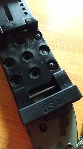 マッカリーナイフが最近リリースしたミリタリーモデルで、見た目が同ブランドがリリースするピットブルをそのまま長くしたような形状のブレードを持つ一丁だったので、強度もピットブル並みかと期待して入手してみましたが、ピットブルのように完全なフルタングナイフではなかったです。軽量化を図ってスケルトナイズされたフルタングナイフなので、ピットブルのような強靭さは持ち合わせていないようなので、ちょっとガッカリでした。