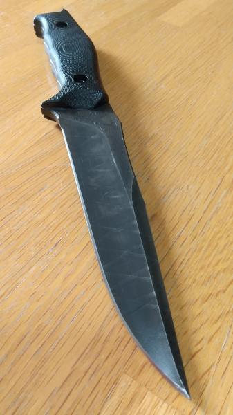 おそらく軽量化を図ってスケルトナイズされたフルタング構造のナイフで、止め刺しに有効なブレードシェイプなので、どちらかというとコンバット・ファイティングナイフというよりも、アウトドア・サバイバルナイフ又はハンティングナイフだと思う。ブレードのコーティングは布なので拭くと剝がれてくるので、いくら拭いても切りがないのと、ハンドルスケールとブレードの間に隙間も見られる。そして一番の課題はシースの改善ではないだろうか。とにかく抜きにくい。