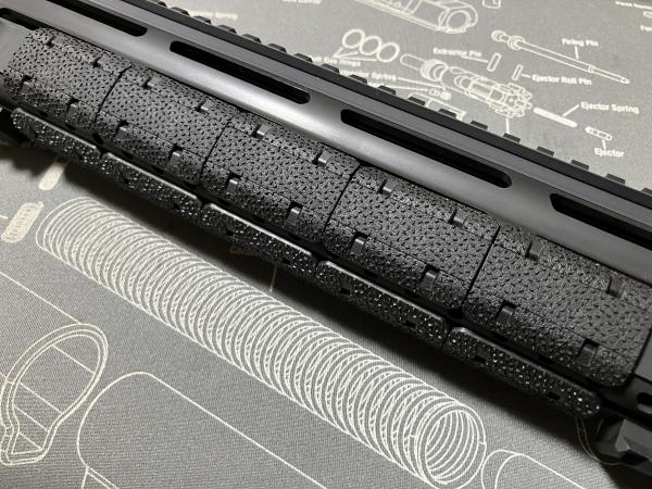 レイルカバー1個で、M-LOKの穴を一個カバーするサイズでした。デザインに関しては好みの問題ですし、他社製品にはケーブルを固定する機能もあったりするので、取り付ける場所によって使い分けたりしたいですね。他には、XTMパネルの時からやっている、何色かを組み合わせて使う方法もあるので、使い方の選択肢は多いですね。