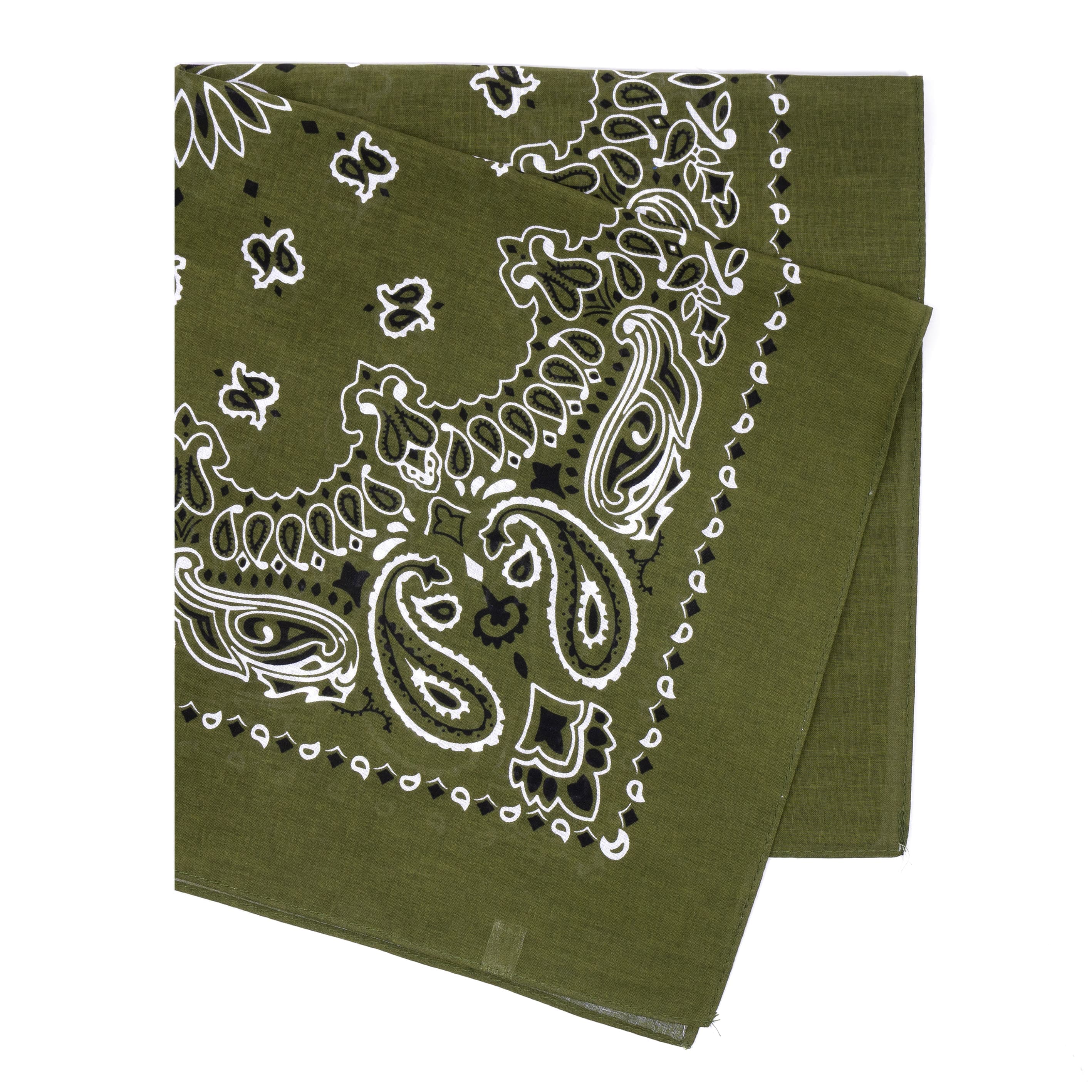 手に取りやすい定番のペイズリー柄バンダナで、綿100%・55cm四方の使いやすいサイズ。