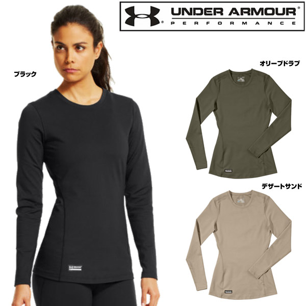サラリとした肌触りの、アンダーアーマーの長袖Tシャツ、コールドギア クルー WOMEN。少しピッちりと着られるフィットタイプで襟首が短め。ウエスト部分が若干細い形になっており女性の体にフィット。裾の右脇部分にアンダーアーマータクティカルの文字とIDを書けるようにしたタグがついています。