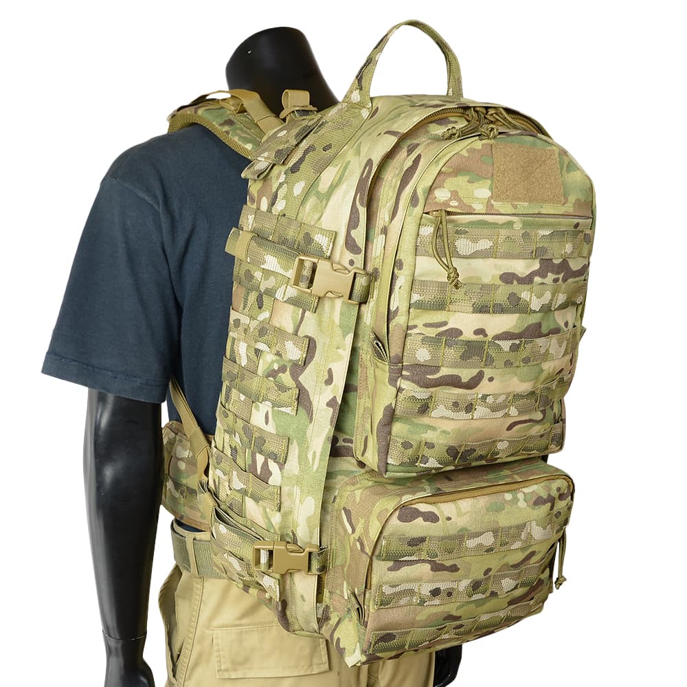 メインコンパートメントを大きく開けるクラムシェル構造の中型パックで、3Dメッシュパッドと、取り外し可能なアルミ/ポリカーボネート製フレームパッド、さらにMOLLE付きウエストベルトを備え、優れた安定性と快適な背負い心地を実現しています。